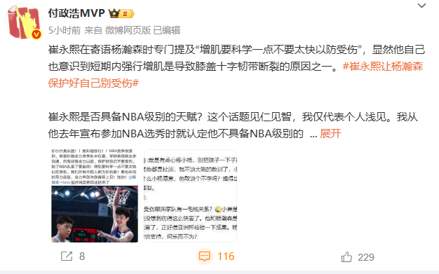 雷速体育7月15日讯 今日,国内媒体人“付政浩MVP”撰文谈及崔永熙,他认为他从崔永熙去年宣布参加NBA选秀时就认定他不具备NBA级别的天赋,但佩服崔永熙自我挑战的勇气和行动力。